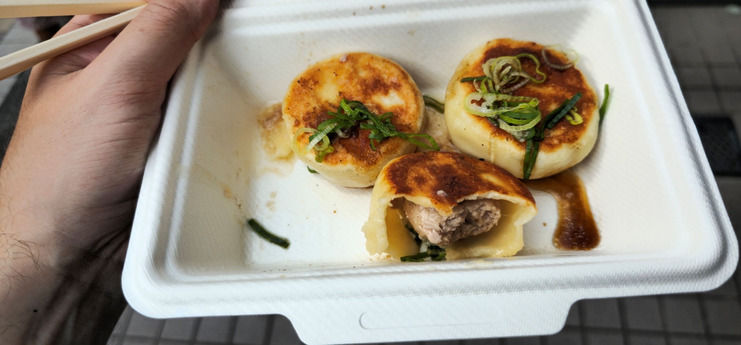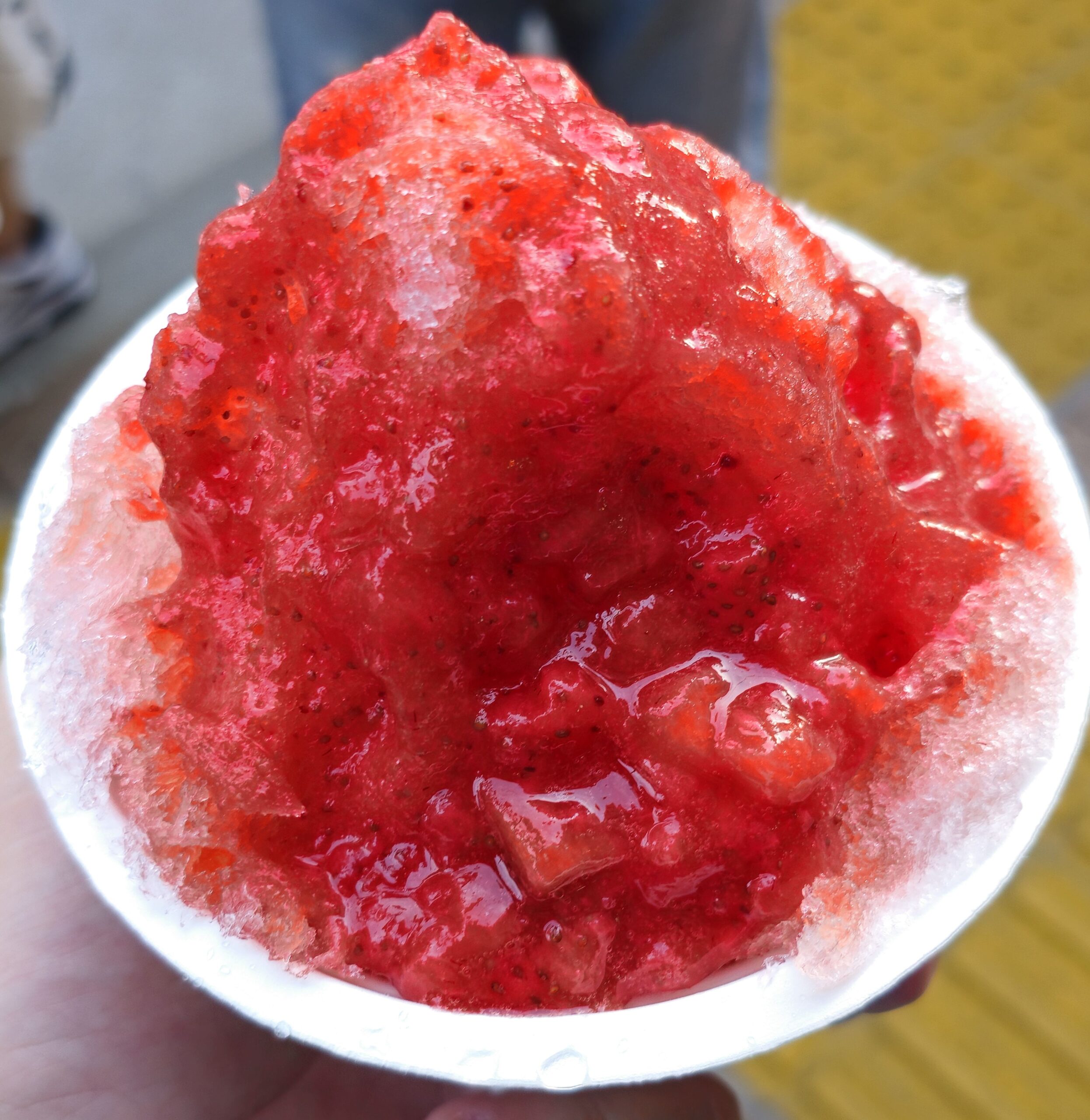 An den Ständen gab es fast ausschließlich Essen und Getränke. Ich probierte gegrillte Xiaolongbao (gefüllte Teigtaschen) und ein traditionelles Erdbeereis aus geraspeltem Eis, Erdbeersauce und Erdbeerkompott.