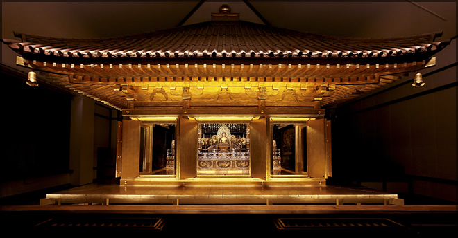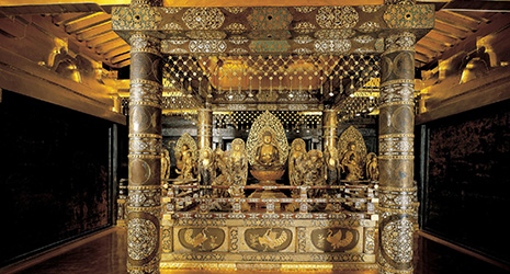 Auf dem Rückweg legte ich einen kurzen Zwischenstopp bei einer Gedenkstätte Takadachi Gikeidō ein, bevor ich weiter zur berühmten Chūson-ji-Tempelanlage wanderte. Dort befindet sich auch das Kinkaku-dō, ein beinahe komplett goldener Pavillon. Um ihn zu schützen, steht er innerhalb eines Gebäudes. Fotografieren ist dort – wie in den meisten Tempelgebäuden – streng untersagt, deshalb habe ich offizielle Bilder der Japan-Tourismus-Seite herausgesucht.