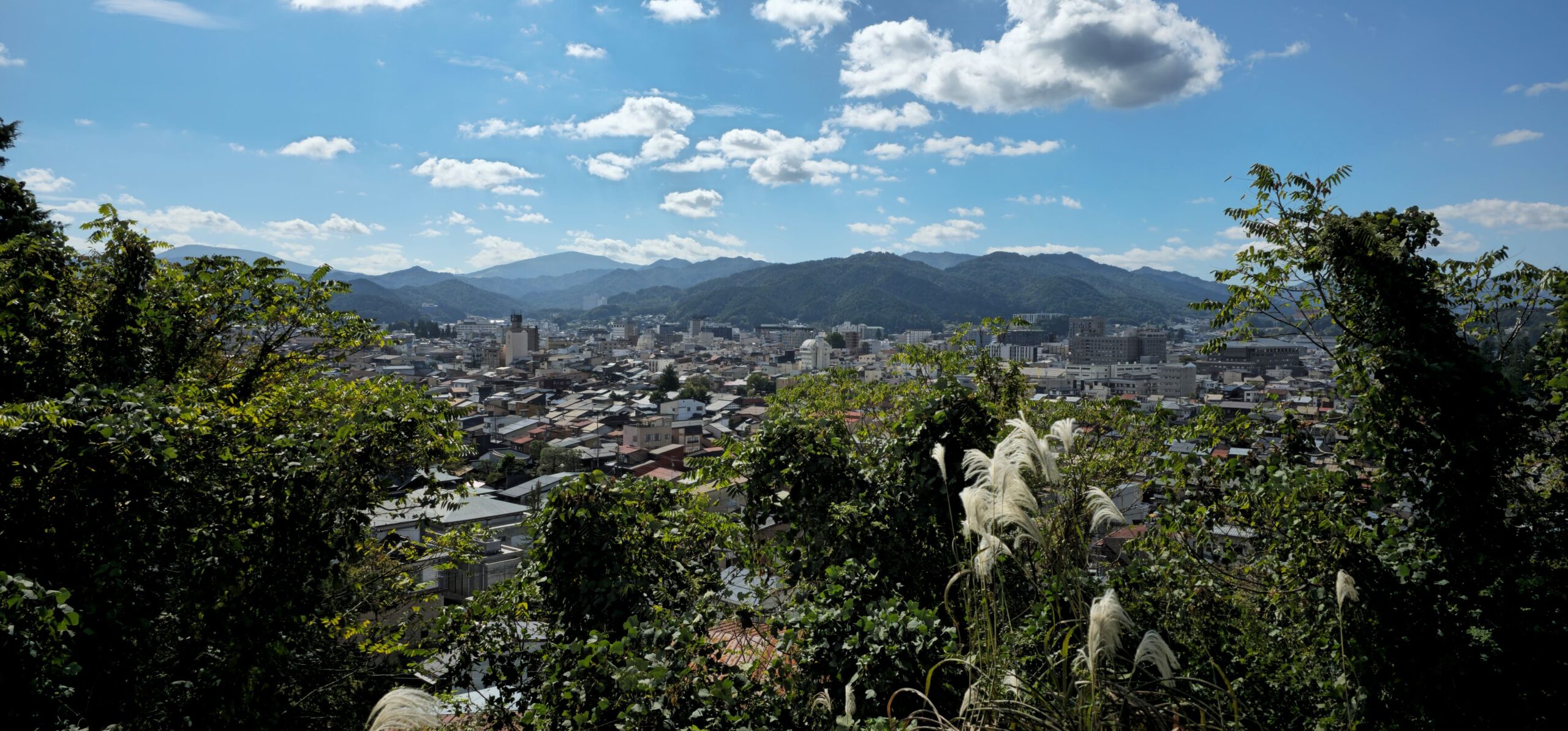 Oben angekommen, gingen wir zu dem ehemaligen Platz der kleinen Burg. Dort sollten noch Überreste zu sehen sein – wir konnten allerdings kaum etwas erkennen. Dafür wurden wir mit einem großartigen Blick auf die höchsten Berge der japanischen Alpen belohnt (drei Gipfel zwischen 3000 und 3200 m).