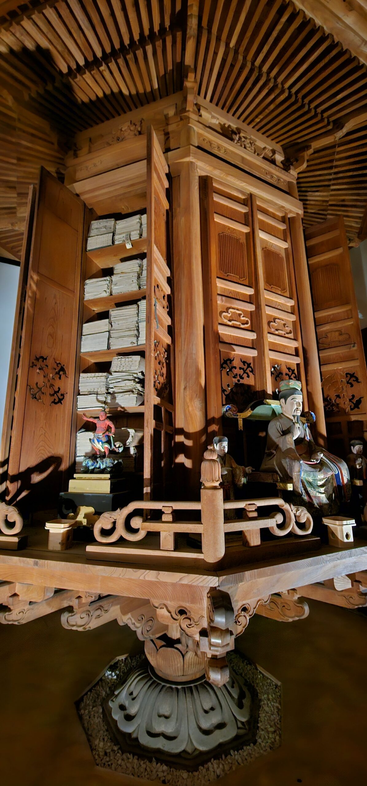 Da die Drehbibliothek etwa 400 Jahre alt ist, darf sie heute nicht mehr bewegt werden. Er meinte jedoch, wenn man einmal darum herumläuft, gelte das als symbolisches Drehen – man glaubt, dass dies dem Lesen aller Sutren gleichkommt.