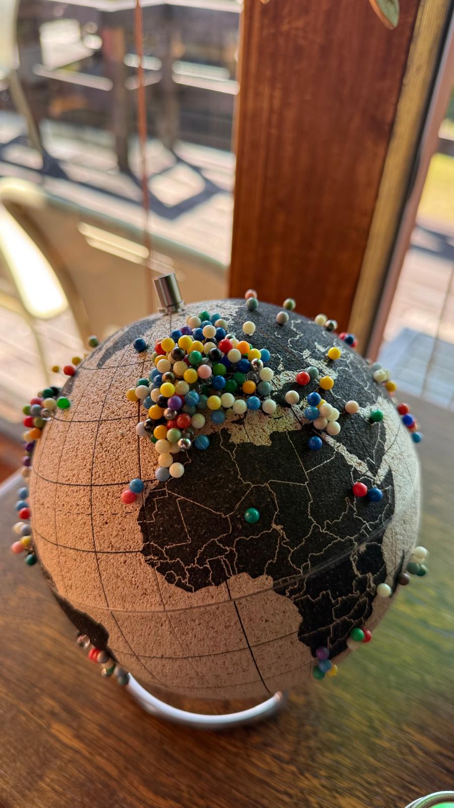 Auf dem Rückweg kehrten wir in das kleine Café ein, tranken etwas und verewigten uns auf einem Globus, auf dem man sein Herkunftsland markieren konnte. Da Europa schon überfüllt war, habe ich keinen weiteren Pin gesetzt. Markus’ zweite Heimat – Sardinien – war dagegen noch komplett frei, also markierte er diese.