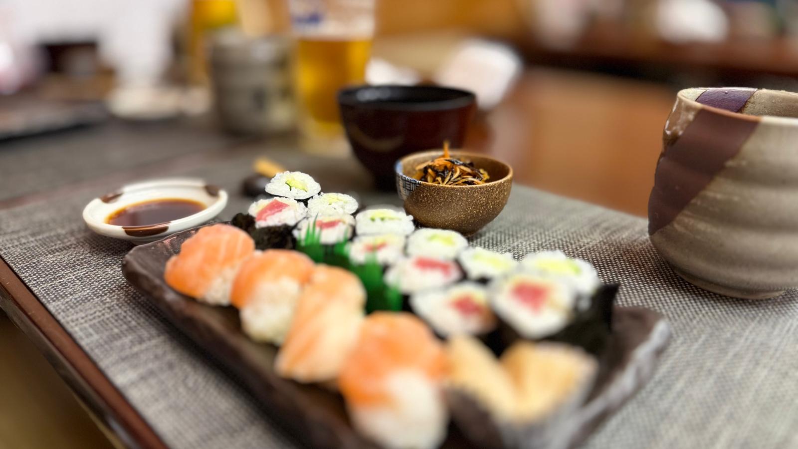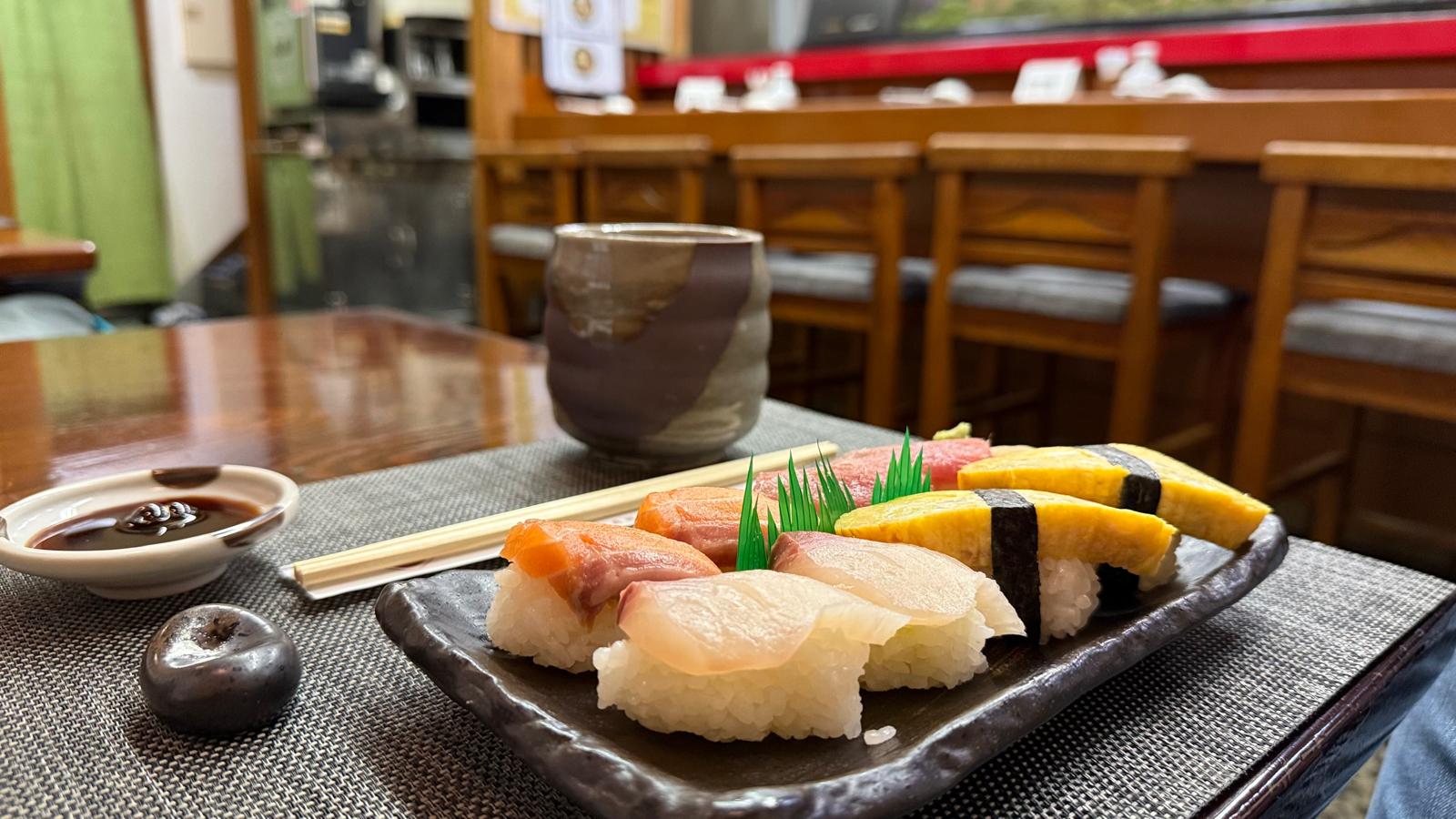 Am Abend besuchten wir ein kleines Sushi-Restaurant, das Markus entdeckt hatte. Es wird von einem älteren Ehepaar betrieben und bietet gerade einmal acht Gästen Platz. Wir hatten großes Glück, ohne Reservierung noch einen Platz zu bekommen – zehn Minuten später wurden bereits alle weiteren Gäste abgewiesen.