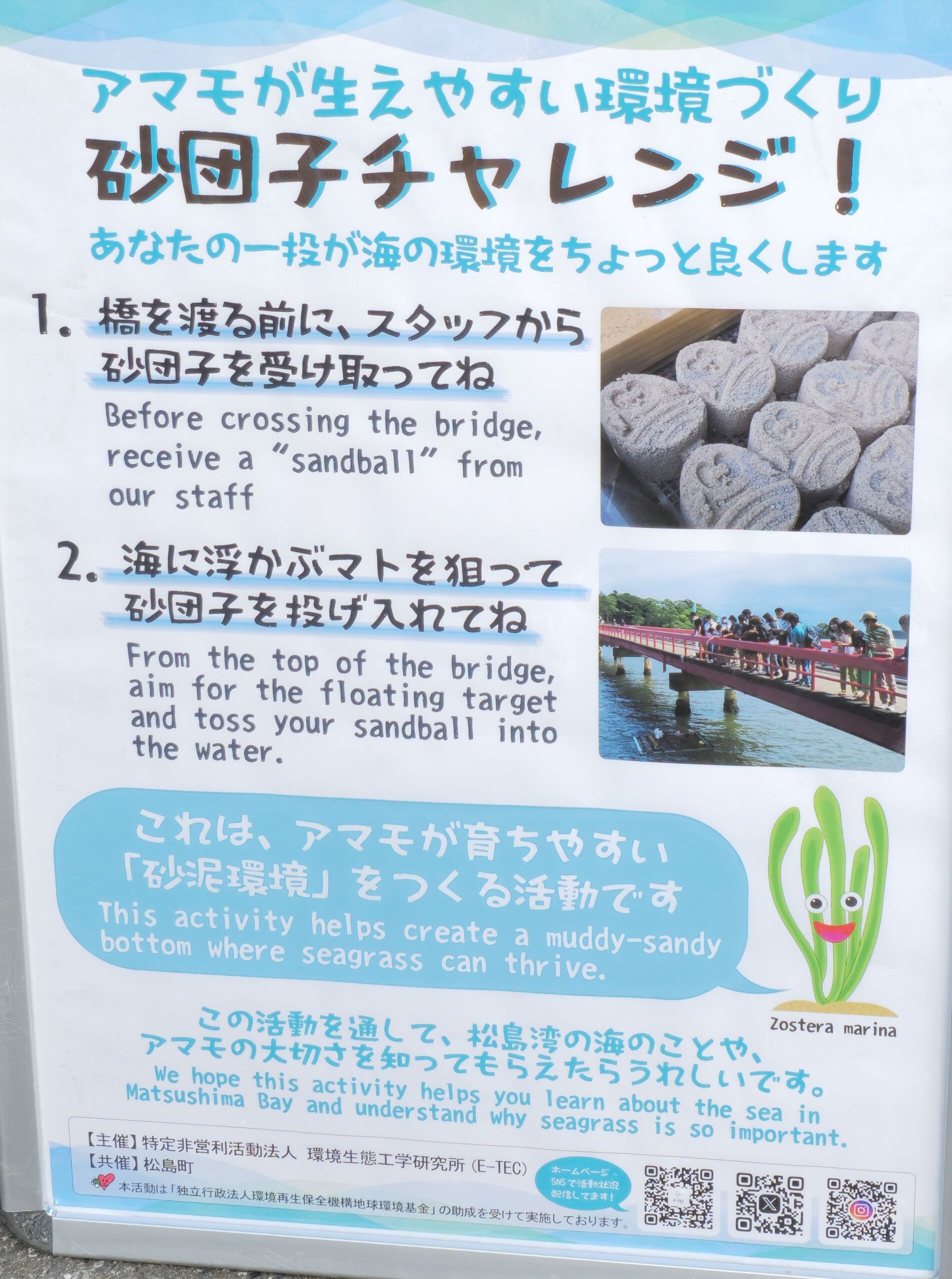 Auf der Brücke fand heute eine besondere Aktion statt: Jeder Besucher bekam einen kleinen Sandball – wie aus einer Sandkastenform – und durfte ihn ins Wasser werfen, um damit schwimmende Froschköpfe zu treffen. Der eigentliche Sinn dahinter: Die Bälle lösen sich auf und reichern den Boden mit Nährstoffen für Algen und Wasserpflanzen an. Die Aktion finde ich sehr spassig. Man hätte die Anreicherung des Bodens unauffällig machen können aber so wurde eine Touristenaktivität daraus. Tolle Idee!