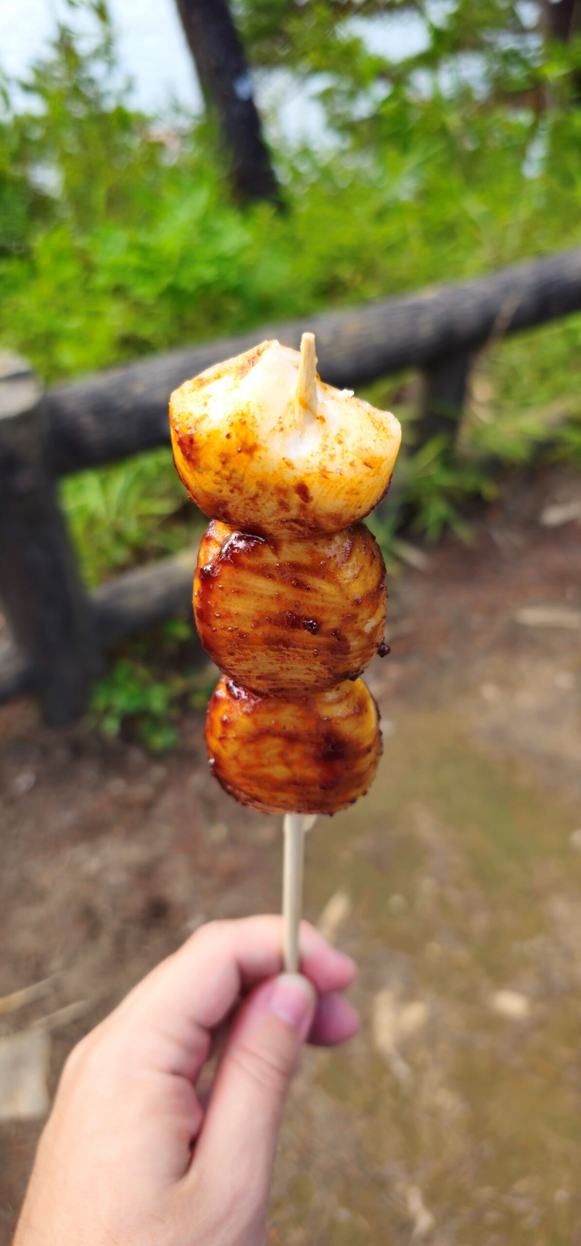 Auf dem Rückweg gönnte ich mir noch Mitarashi Dango – gegrillte Reisbällchen, über Holzkohle geröstet und anschließend mit einer süßlich-herzhaften Sojasauce mariniert. Herrlich!
