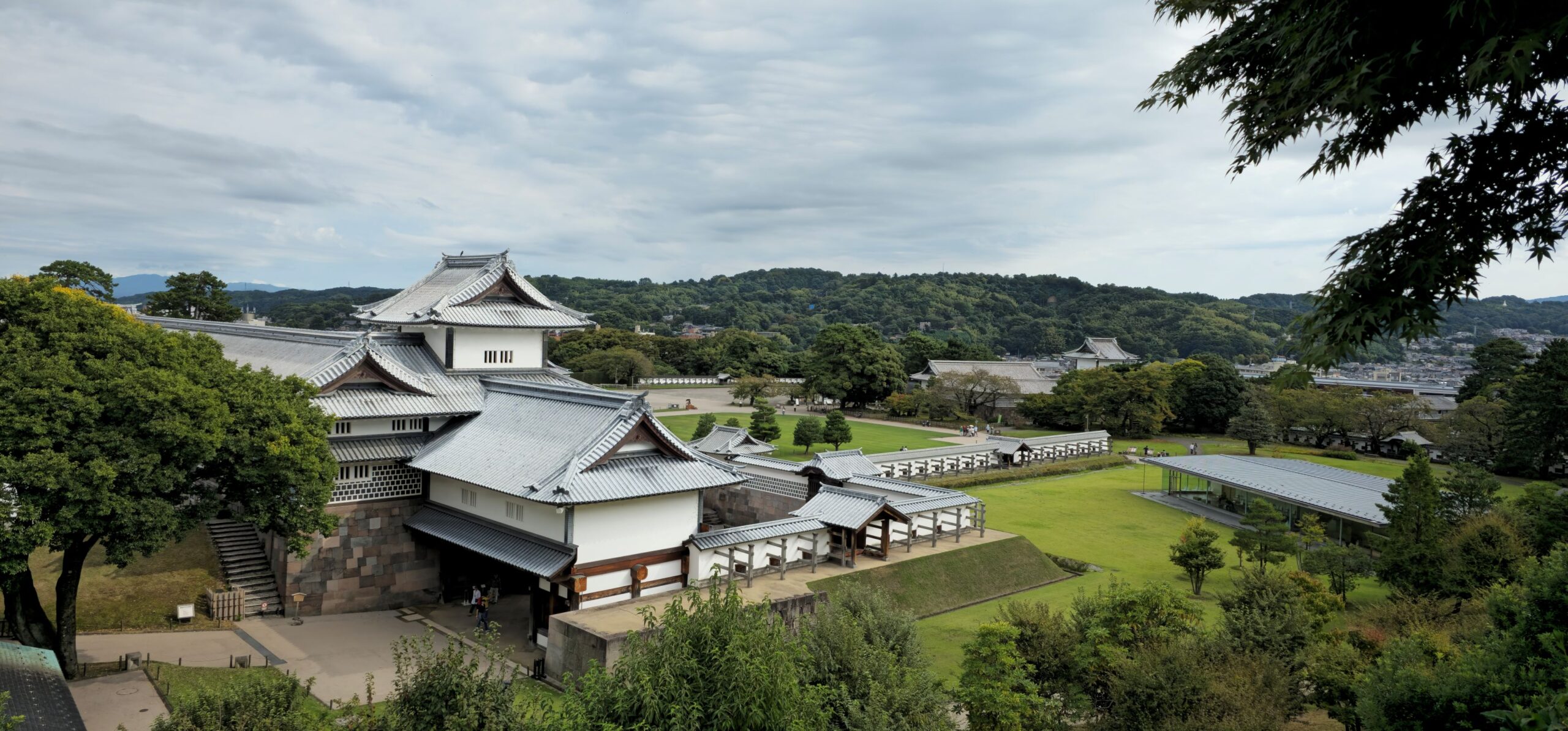 Wir machten uns also früh vom Hotel auf in Richtung eines Starbucks – und entdeckten unterwegs zufällig einen schönen Tempel. Der Goshuin-Schalter war allerdings noch geschlossen, also blieben wir nicht allzu lange, denn der Kaffee rief. Nach dieser Stärkung gingen wir zur Kanazawa-Burg. Soweit wir sehen konnten, ist sie größtenteils rekonstruiert, und der Palastbereich wird derzeit noch nachgebaut. Das Gelände war weitläufig, und da die Sonne immer mehr die Oberhand gewann, ergaben sich viele schöne Szenerien.