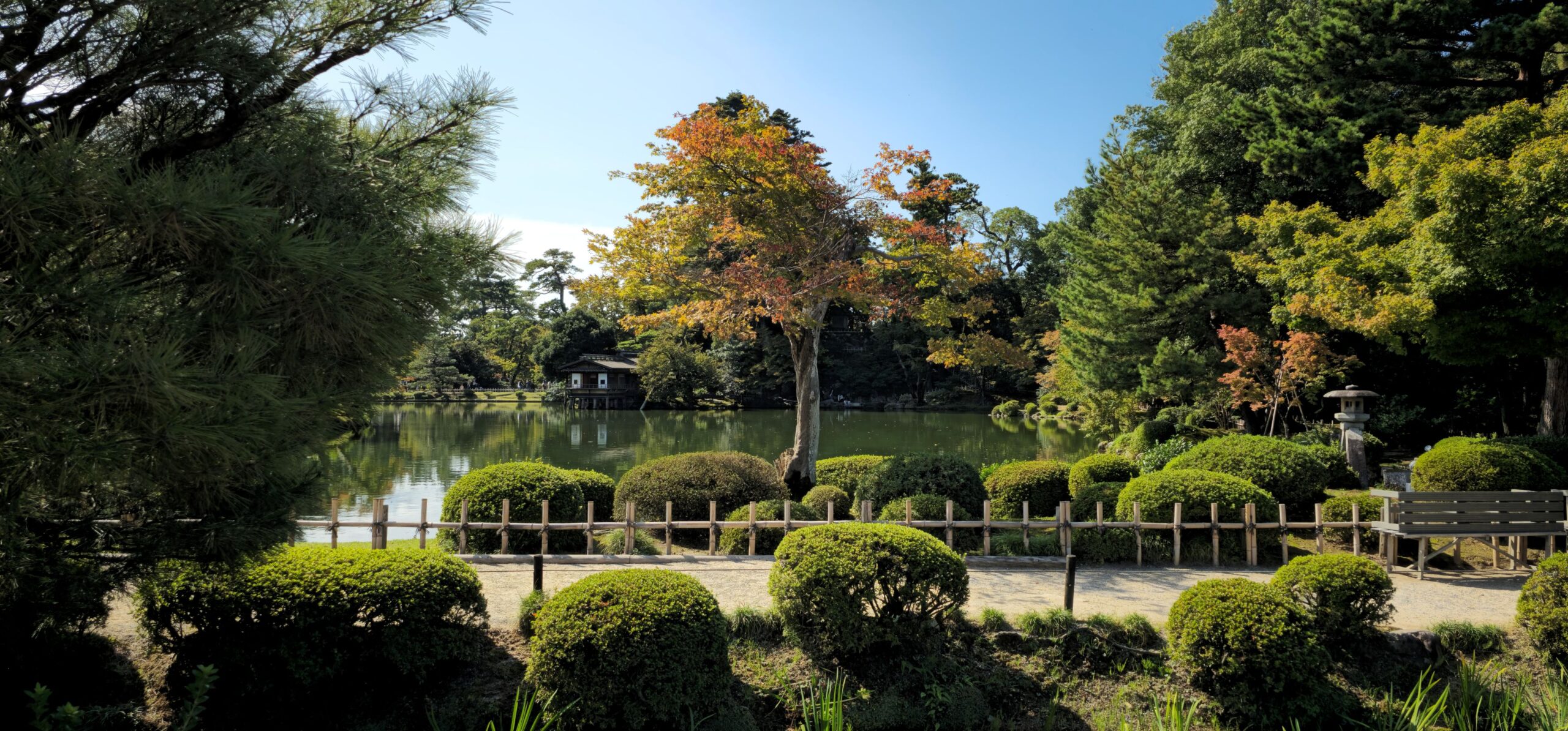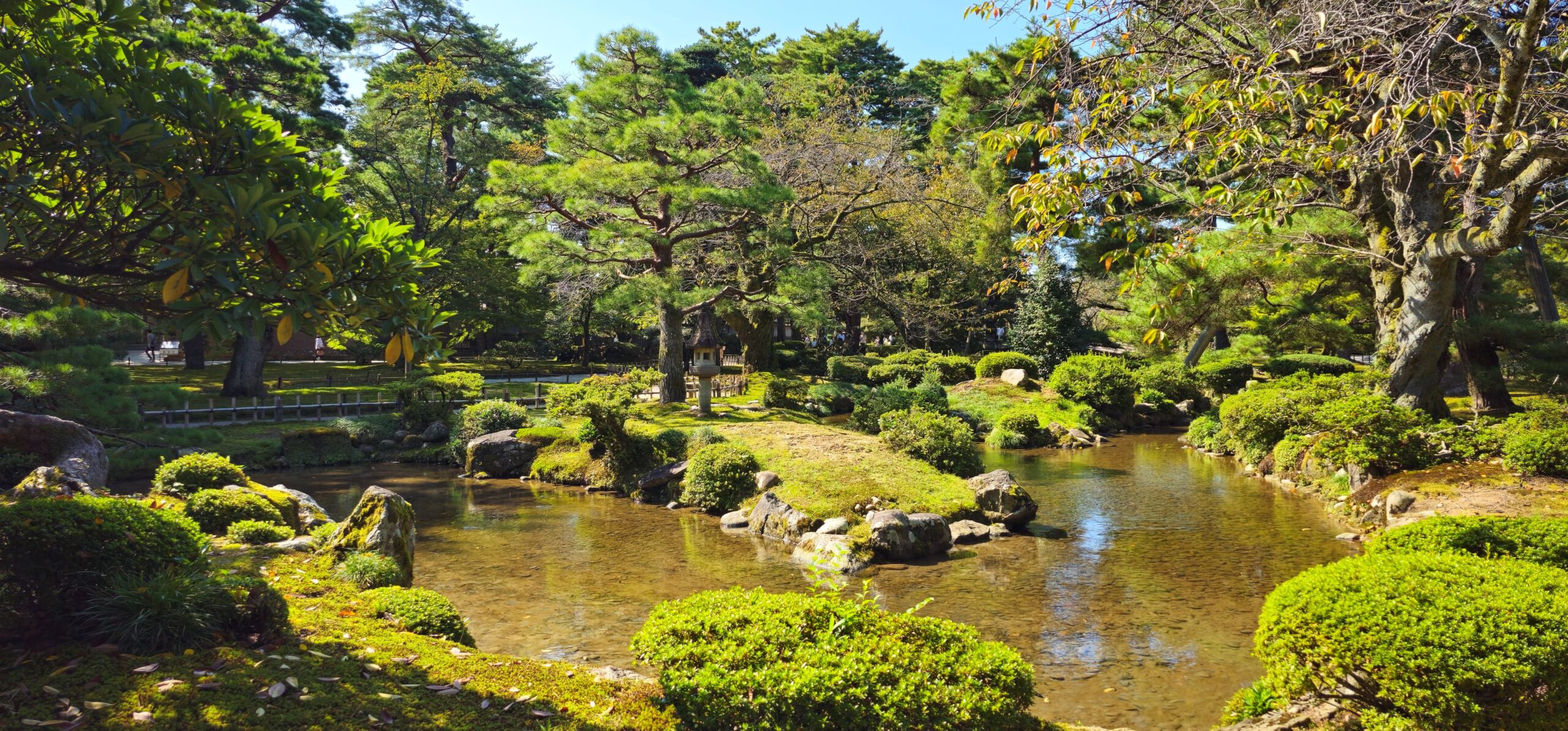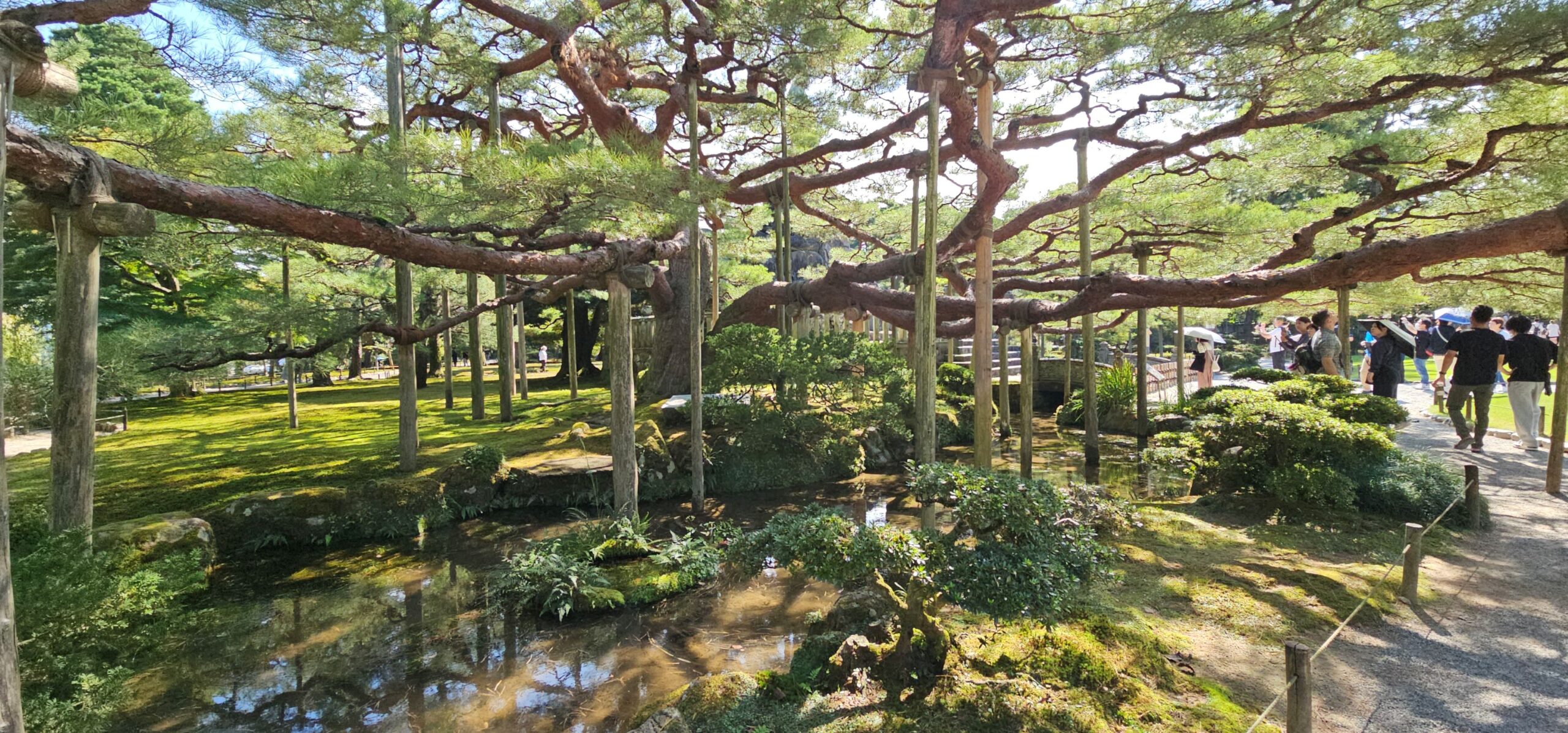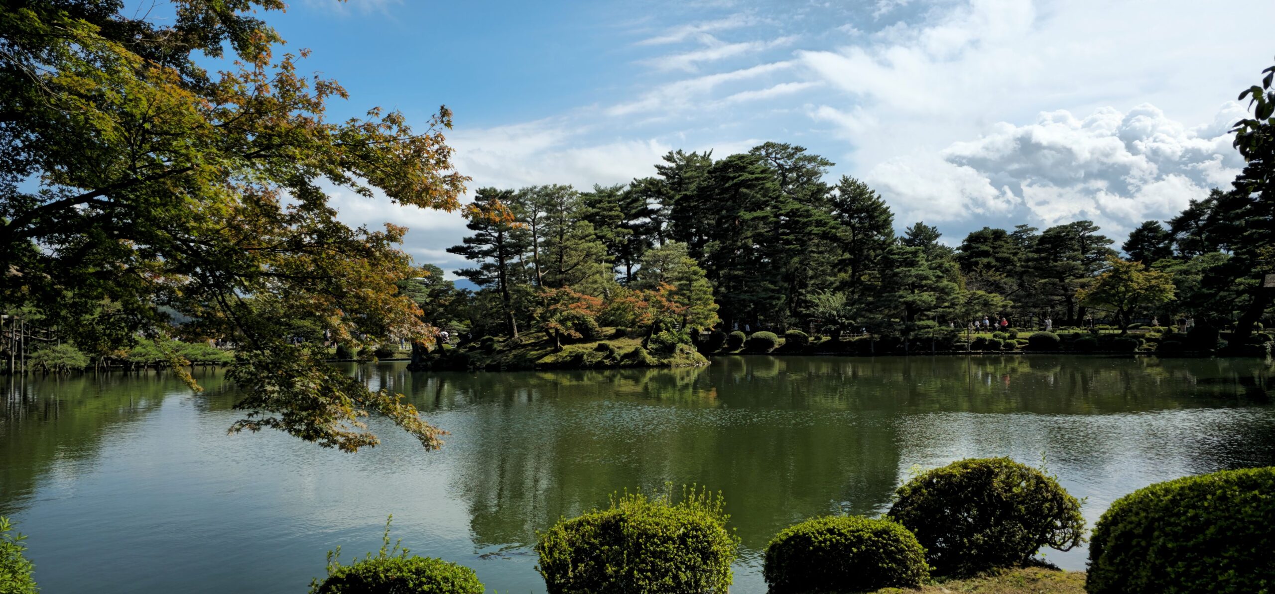 Direkt neben dem Burggelände liegt der große Garten Kenroku-en. Er war wunderschön mit kleinen Bächen und einem großen Teich angelegt. Da Sonntag und schönes Wetter war, tummelten sich dort entsprechend viele Besucher. Trotzdem gab es immer wieder ruhige Ecken zum Verweilen – nur bei den besten Fotomotiven musste man etwas Geduld haben. Auch die alten Teehäuser fügten sich wunderbar in die Gartenatmosphäre ein, auch wenn wir keines davon besuchten.