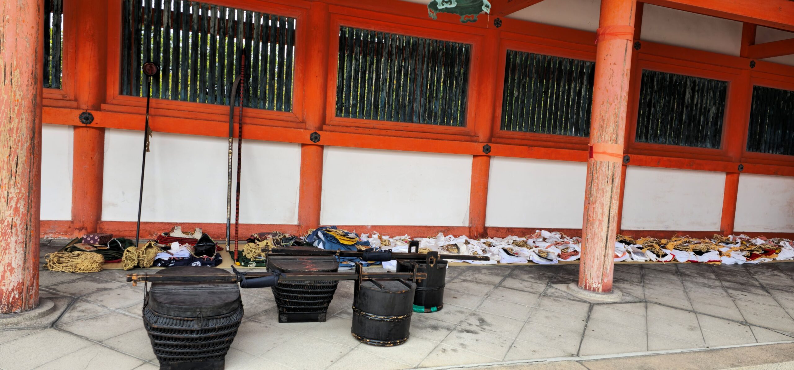 Auf dem Rückweg lag eine weitere große Tempelanlage, die wir ebenfalls besuchten. Zufällig war das genau der Tempel, der das Festival organisierte, das am nächsten Tag stattfinden sollte. Wir konnten dort also ein spezielles Goshuin vom Festival bekommen und sahen einige Vorbereitungen: In den Seitengängen lagen bereits viele Kostüme bereit.
