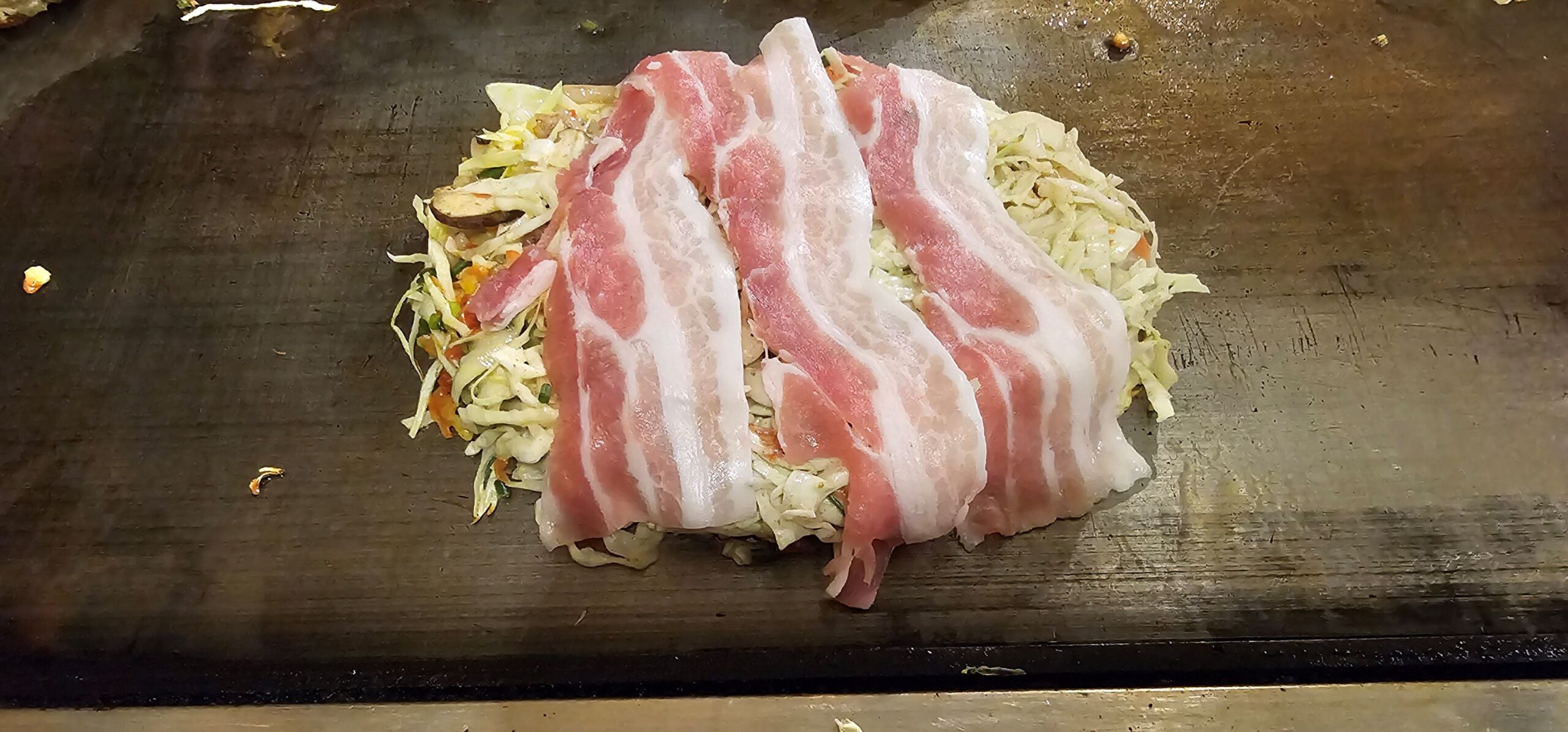 Bevor man den Okonomiyaki dreht (nach ca. 8 Minuten), kommt noch Speck darauf.
