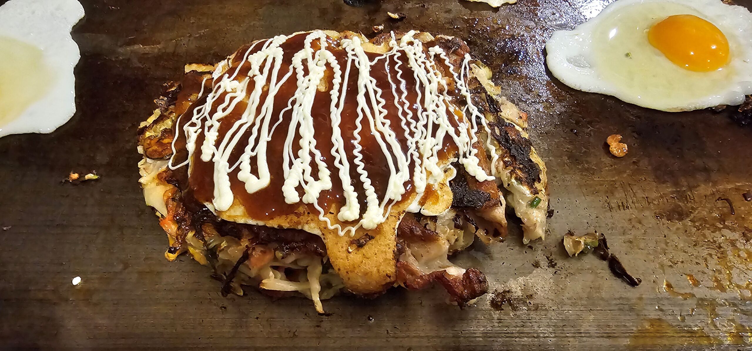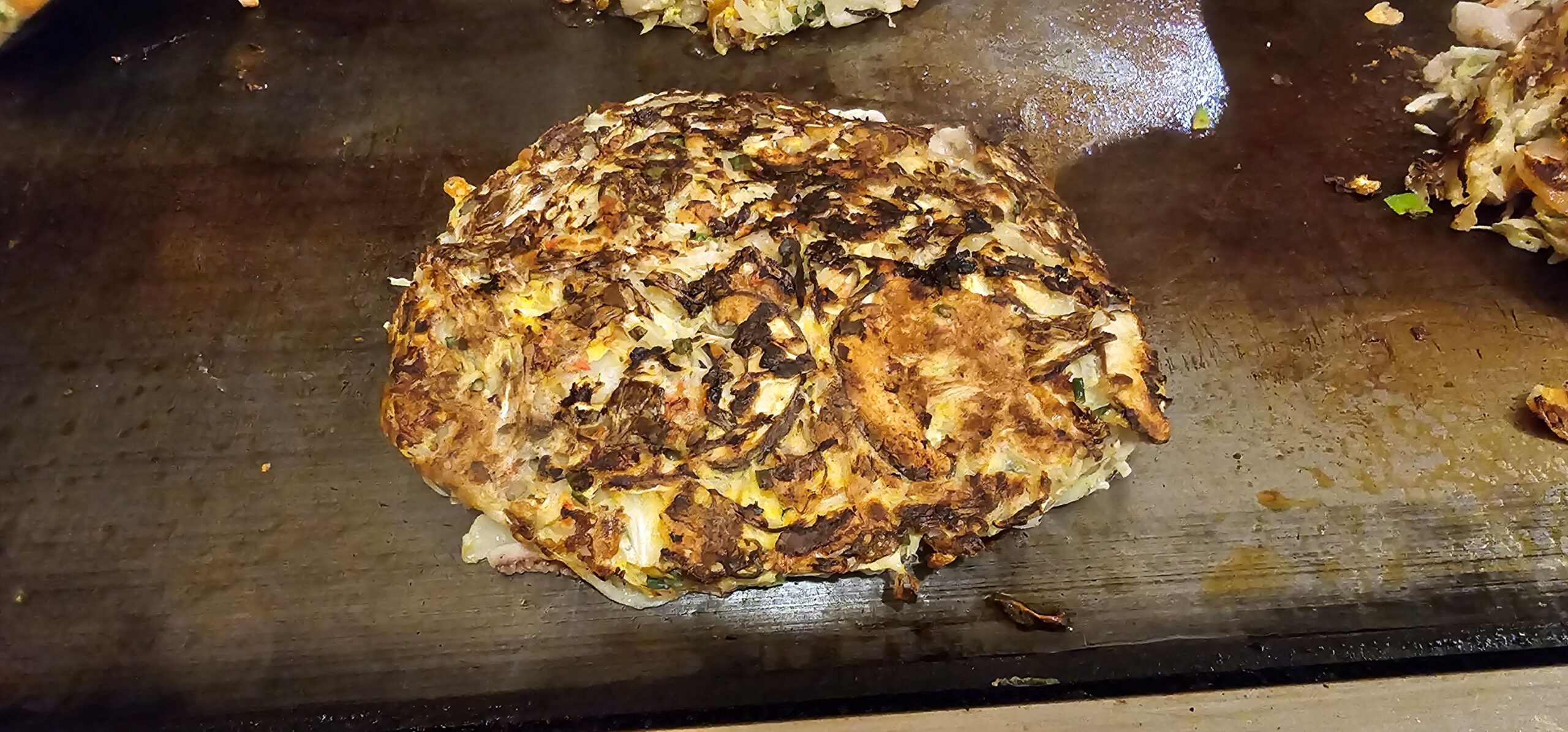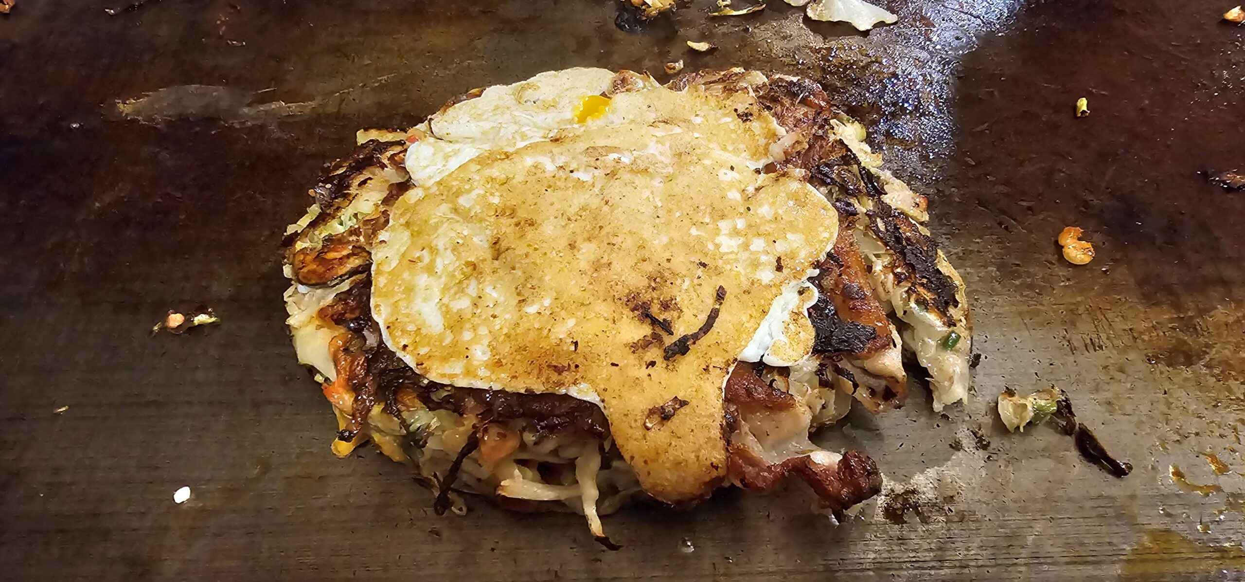 Hier sieht man den gewendeten Okonomiyaki. Parallel dazu wird ein frisches Spiegelei auf der Platte gebraten.