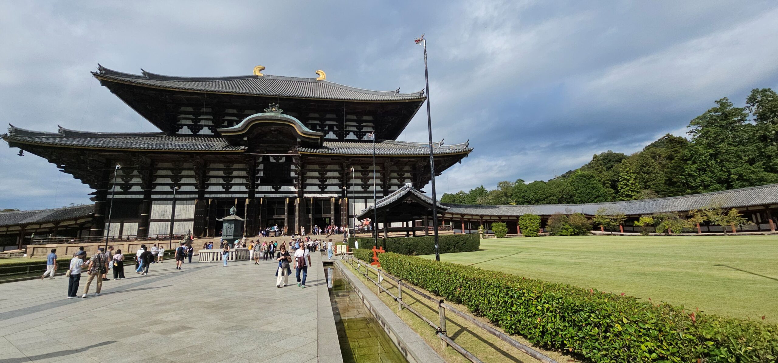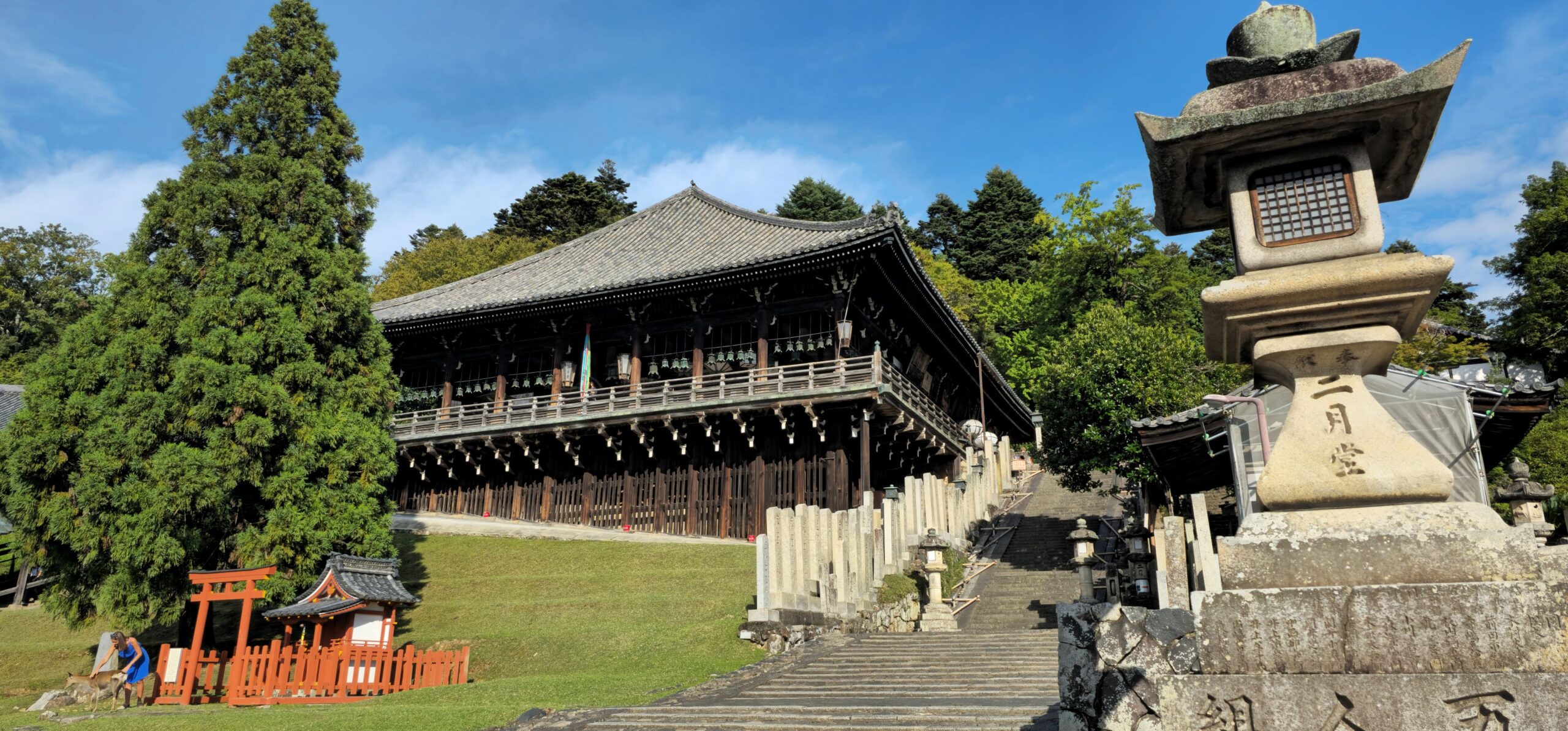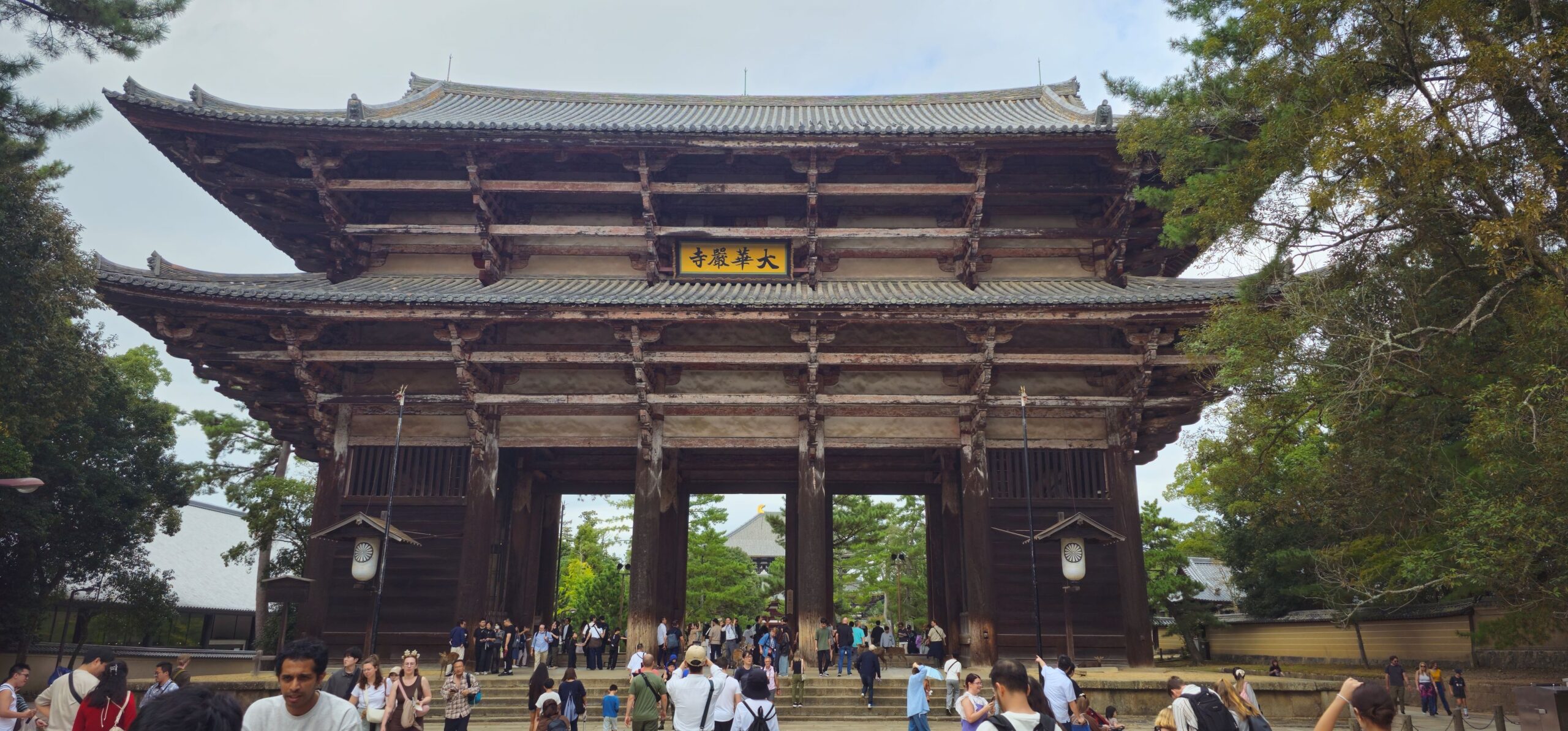 Danach ging es weiter zur größten Tempelanlage Naras: Todai-ji. Schon das riesige Eingangstor ist größer als viele ganze Tempel und beeindruckt mich jedes Mal aufs Neue. Die große Buddha-Halle übertrifft das natürlich noch – schließlich muss dort eine 15 Meter hohe Buddha-Statue (ohne Sockel und Fächer dahinter) Platz finden. Die Anlage wurde im 8. Jahrhundert gegründet. Natürlich mussten sowohl das Gebäude als auch die Statue seither mehrfach wiederaufgebaut werden, aber es ist dennoch beeindruckend, dass in Japan schon damals solche Bauwerke entstanden. Während man hier riesige Bronzestatuen goss, hatte man in Europa gerade erst begonnen, grundlegende Handwerkstechniken wiederzuerlernen.