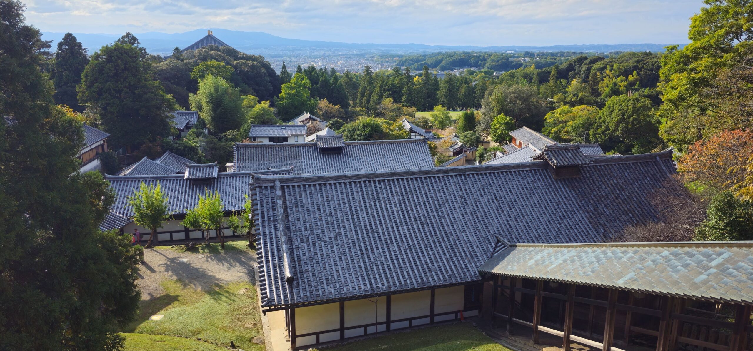 Anschließend verließen wir die Menschenmassen und gingen zu einem ruhigeren Teil der Anlage, etwas höher am Hang gelegen. Dort befindet sich ein Tempel mit fantastischem Blick über Nara. Direkt daneben liegt ein kleines Café, das japanische Süßigkeiten serviert. Ich gönnte mir ein Eis, Markus einen Matcha auf Eis – perfekt zur Pause.
